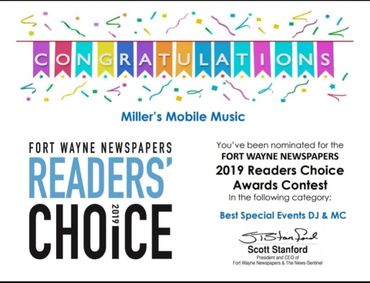 Miller’s Mobile Music is YOUR premier source for special event entertainment! We specialize in wedding reception entertainment, but also provide complete and flexible reception DJ services, party DJ services, event DJ services and dance DJ services. Not “just a DJ” we also provide COMPLETE mobile music entertainment, public address and sound reinforcement for a variety of special events such as local Fort Wayne area Dance Competitions, Road Races (Veterans Marathon, HUFF, Galloping Gobbler, Three rivers running 12k) and those are just some of the things that we do.I personally have experience as a wedding DJ, a club DJ, DJ for school dances, birthday parties, and other various public events. I am the enthusiastic DJ that you are looking for!